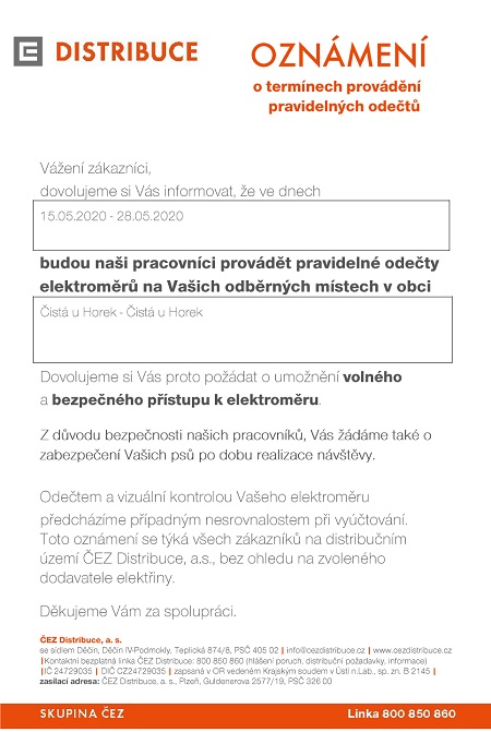 Úvod > Obec > Aktuality > ČEZ avizuje odečet elektroměrů v obci