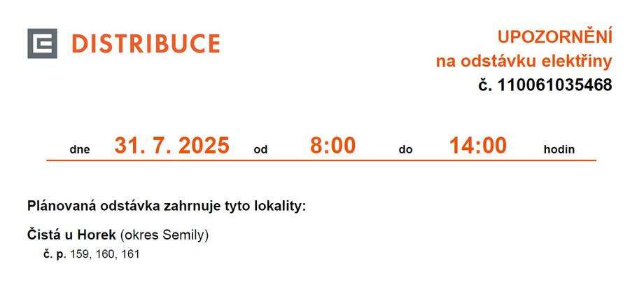 ČEZ Distribuce a.s. oznamuje krátkodobé přerušení dodávky elektřiny u několika domácností ve středu obce dne 31.7.2025. Důvodem je výměna zařízení distribuce poškozeného začátkem února při dopravní nehodě: