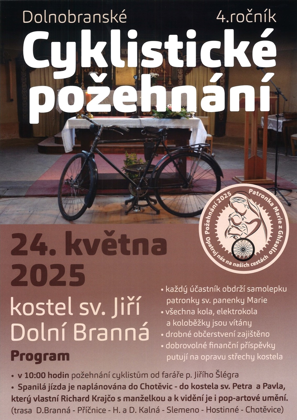 V sobotu 24. května 2025 od 10 hodin se v kostele sv. Jiří v Dolní Branné bude konat již 4. ročník cyklistického požehnání. Památeční samolepky pro cyklisty připraveny, drobné občerstvení zajištěno, spanilá jízda naplánována, tak nezbývá než se dostavit se svým dopravním prostředkem????. Vybrané dobrovolné finanční prostředky jsou věnovány panu faráři Šlégrovi na opravu střechy místního kostela.