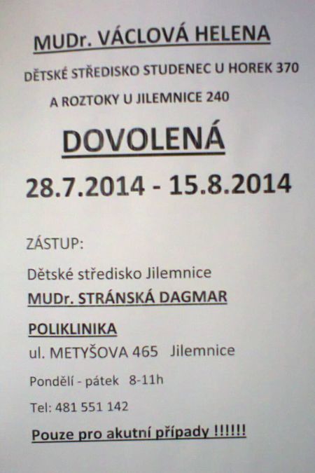 Paní doktorka Václová avizuje čerpání dovolené ve dnech 28.7. - 15.8.2014. V těchto dnech ji v akutních případech bude zastupovat MUDr. Dagmar Stránská v Jilemnici.