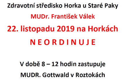Úvod > Obec > Aktuality > Dovolená MUDr. Válek - 22. listopadu