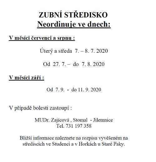 Úvod > Obec > Aktuality > Dovolená na zubním středisku Horka - Studenec během letních měsíců roku 2020