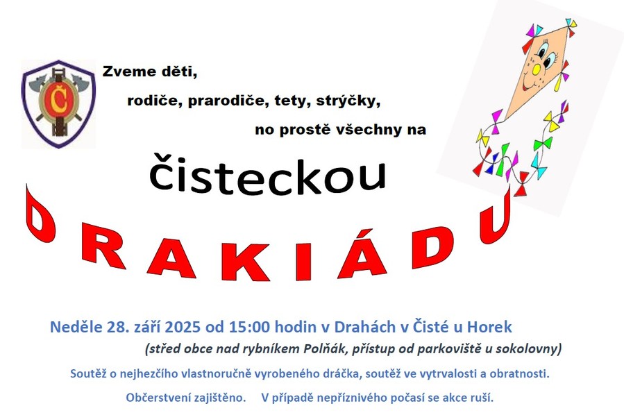 Čistečtí hasiči zvou na tradiční drakiádu. Tentokrát o trochu dříve, už v neděli 28. září 2025. Na obvyklém místě na Drahách (louka mezi cestou k rybníku Polňák a cestou z obce proti sokolovně) budou připraveny soutěže v délce letu nebo o nejhezčího vlastnoručně vyrobeného draka. Nebude chybět občerstvení pro děti i dospělé. Tak Přiďte pobejt!