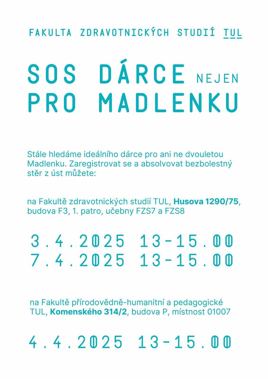 Na Technické univerzitě v Liberci poběží nábor do registru dárců kostní dřeně. Pomoci malé Madlence, která naléhavě potřebuje dárce kostní dřeně, ale i jiným nemedializovaným pacientům můžete i vy. Jak? Stačí se odhodlat a zaregistrovat se do Českého národního registru dárců kostní dřeně. Nábor dárců poběží ve třech dnech na Technické univerzitě v Liberci. Čím více zájemců dorazí, tím větší bude šance, že se najde správný dárce pro konkrétní pacienty. Tuto dobrovolnou akci pořádají společně Dobrovolnické centrum TUL, Dárcovské centrum Liberec při Transfuzním oddělení Krajské nemocnice v Liberci a Fakulta zdravotnických studií TUL.