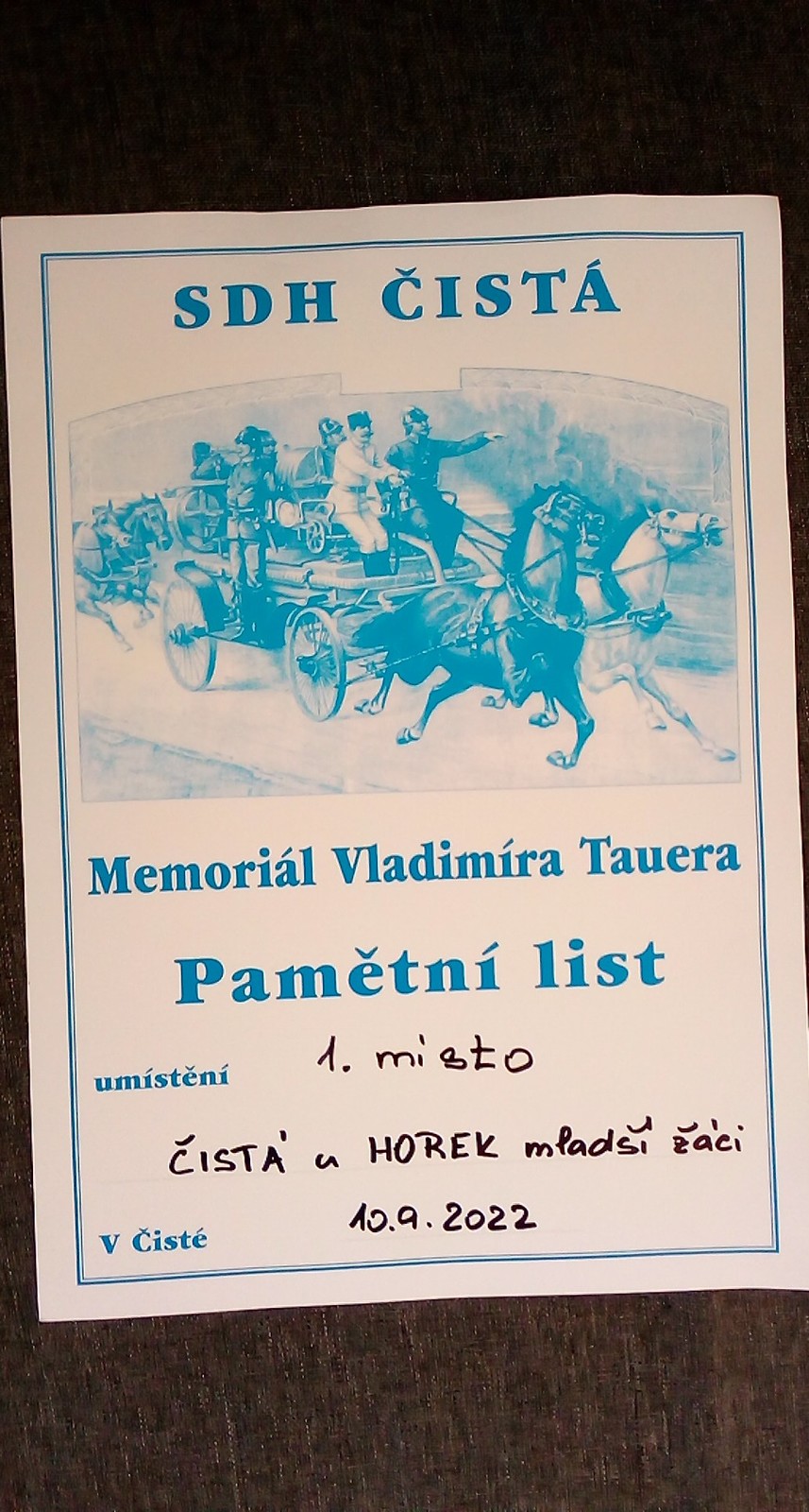 V sobotu 10. září 2022 reprezentovalo družstvo mladších dětí a jednotlivci naši obec na Memoriálu Vladimíra Tauera v Čisté (u Litomyšle). Z jednotlivců si nejlépe vedl Ondra Zaplatílek, který v mladších obsadil třetí místo. V družstvech mladší kategorii pak naše děcka vyhrála. Děkujeme za reprezentaci !