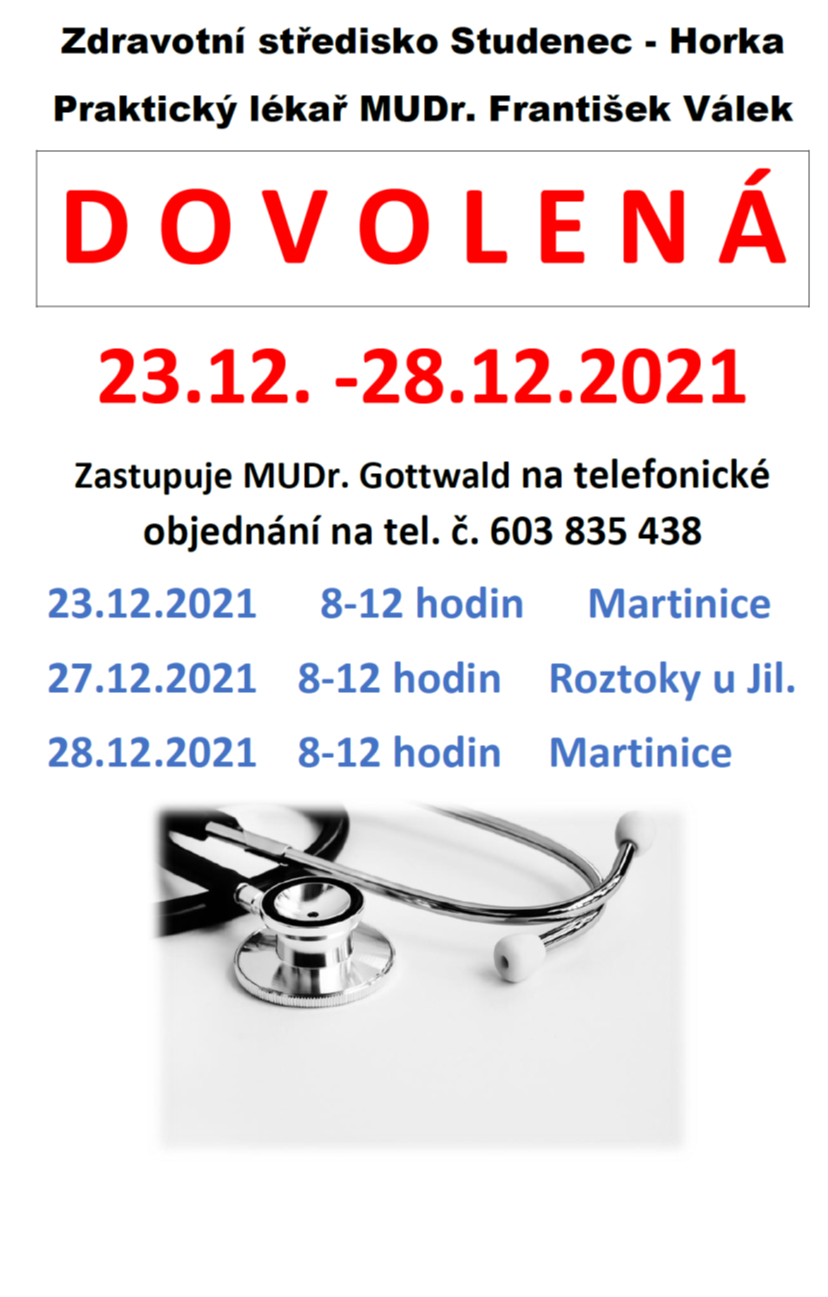 Úvod > Obec > Aktuality > MUDr. Válek - dovolená na konci roku 2021