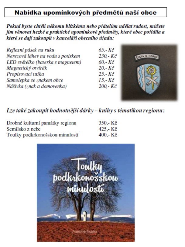 Zaktualizovali jsme nabídku reklamních předmětů, které si můžete zakoupit v kanceláři obecního úřadu. Sortiment je ještě trochu větší, ale pak už jde o pár zbývajících kousků (deštníky, hrnečky, obecní vlajky), které nabídneme až v kanceláři....