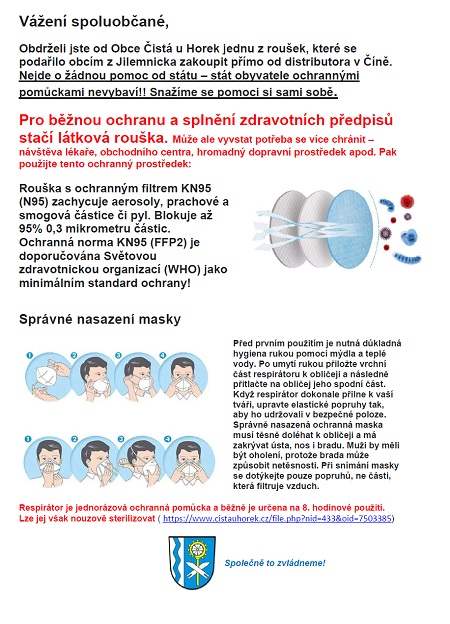 Dnes odpoledne (16.4.2020) rozvezou naši hasiči do domácností trvale přihlášeným spoluobčanům ve věku 2-69 let ochranné respirátory FFP2. Jde o druhou vlnu ochranných prostředků. V první byly respirátory distribuovány lidem 70+, což je nerizikovější skupina. Nyní jsou zdarma respirátorem vybaveni i všichni ostatní, kterých se povinnost jejich užívání týká. Upozorňujeme, že pro běžné užívání stačí textilní rouška. Respirátor je vhodnější použít tam, kde se potkává více lidí nebo jde o rizikové prostředí (nemocnice, čekárna lékaře apod.) Do obálek k rouškám byl přibalen i tento leták: