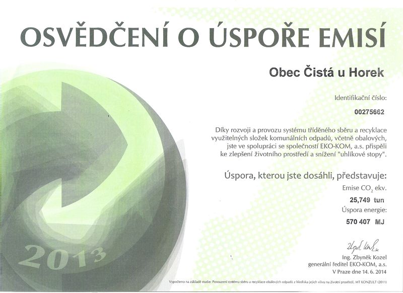 V těchto dnech jsme obdrželi od společnosti EKO-KOM "Osvědčení o úspoře emisí za rok 2013". Z něho vyplývá, že proti roku 2012 jsme v Čisté loni tříděním dokázali uspořit o 8,44 tun ekv. CO2 více. Z toho je jasně vidět, jak roste objem vytříděných obalů, které jsou díky recyklaci znovu využitelné a přispívají ke snížení tzv."uhlíkové stopy" . Za tento výsledek se sluší všem uvědomnělým lidem v Čisté poděkovat.