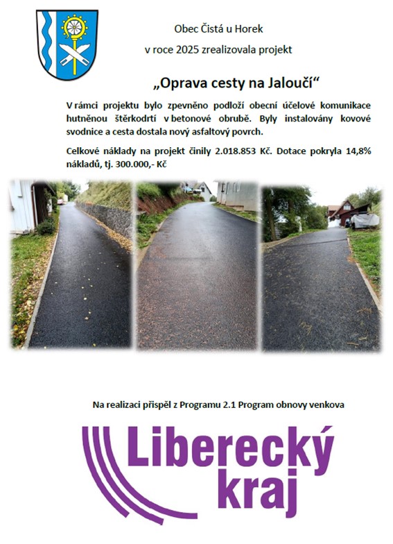 Poněkud obrácený gard má letos provedená oprava cesty na Jaloučí. Tuto zakázku v hodnotě 2.018.853,11 Kč už během dubna a května 2025 zrealizovala firma Setter a.s. Ještě před realizací jsme ale podali žádost o podporu z Dotačního fondu Libereckého kraje, programu 2.4 - Program obnovy venkova. Usilovali jsme o maximální možnou podporu z tohoto zdroje, což je 300.000,- Kč. Naše žádost byla nakonec úspěšná, což stvrdilo uzavření dotační smlouvy v září letošního roku. Akce je hotová, dotace vyúčtována a čekáme jen na převod dotační podpory na účet obce....