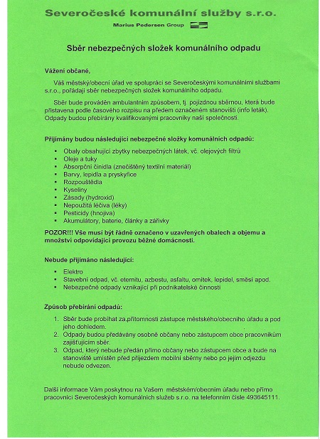 V rámci podzimních sběrů proběhne v sobotu 26. září 2020 ve spolupráci s firmou SKS (Marius Pedersen) tradiční sběr nebezpečných složek komunálního odpadu. Pozor - proti minulým letům dochází k posunu časů na jednotlivých stanovištích, kde sběrná kolona bude tentokrát trochu dříve: