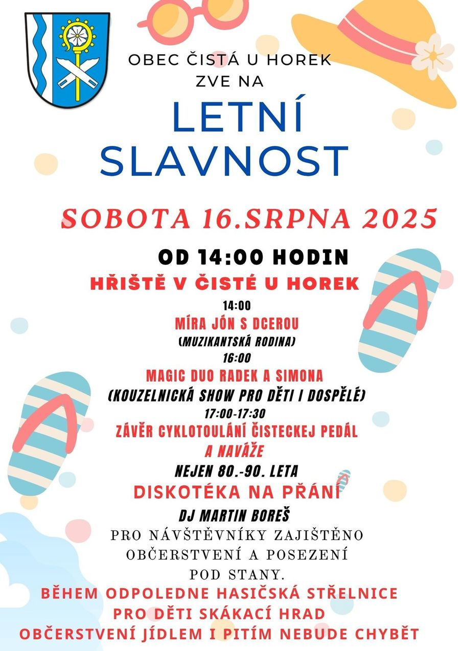 Chceme využít areál na hřišti postavený pro Čisteckej pedál. Proto Obec na sobotu 16. srpna 2025 zve na odpolední program pro děti i dospělé s názvem Letní slavnost. Přiďte pobejt!