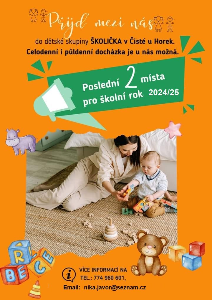 Čistecká dětská skupina nabízí poslední volná místa malým dětem pro příští školní rok....