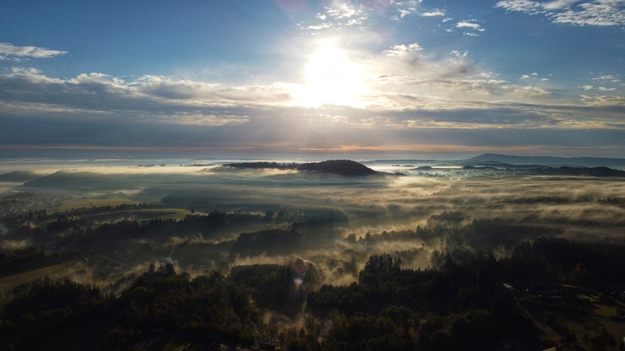 Na fotografii Vojtěcha Kotyka pořízené z dronu je masiv Čistecké Hůry vystupující z ranní mlhy.