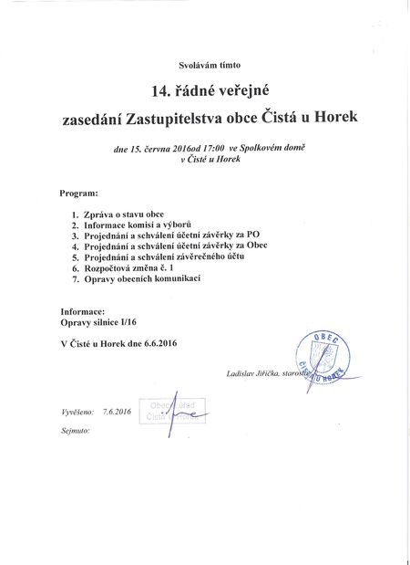 Úvod > Obec > Aktuality > Svolání 14. veřejného zasedání zastupitelstva obce