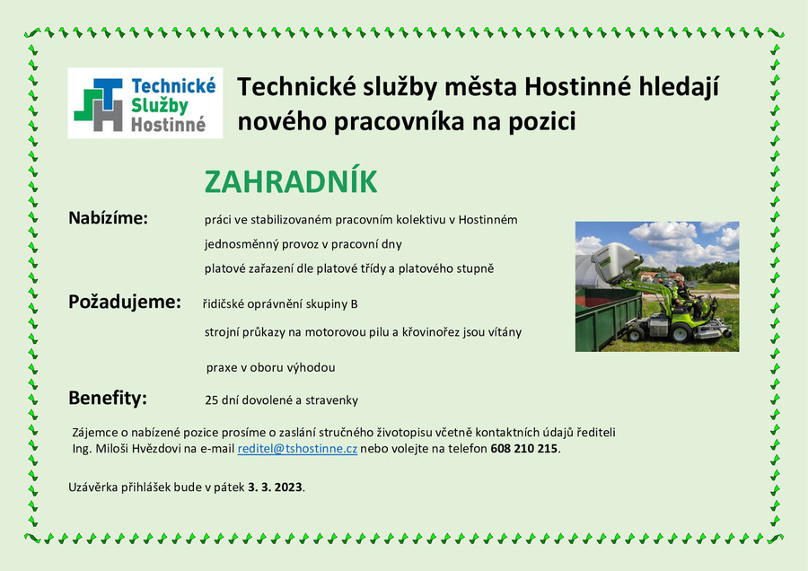 Úvod > Obec > Aktuality > Technické služby Hostinné hledají zahradníka