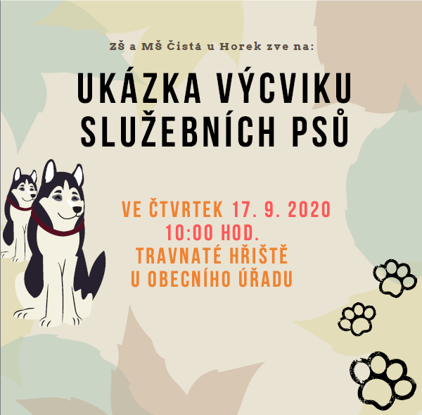 Čistecká škola zve na ukázku výcviku služebních psů. Proběhne ve čtvrtek 17. září 2020 dopoledne. Akce se koná venku, proto není třeba zakrytí dýchacích cest. Vhodné dodržovat bezpečný odstup. Škola zve rodiče, maminky s dětmi na mateřské dovolené nebo prarodiče.