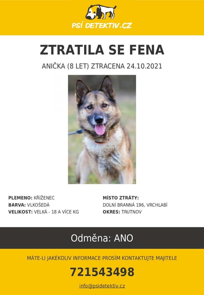 Anička je cca 8 let stará fenka křížence německého ovčáka, střední vzrůst. Má černý obojek s oranžovým okrajem, je čipovaná a váží cca 25 kg. Je hodná, ale vůči cizím nedůvěřivá, neublíží. Ztratila se z nového domova, kde byla první den. Protáhla se na zahradu v nestřeženém okamžiku a utekla, okolí nezná!