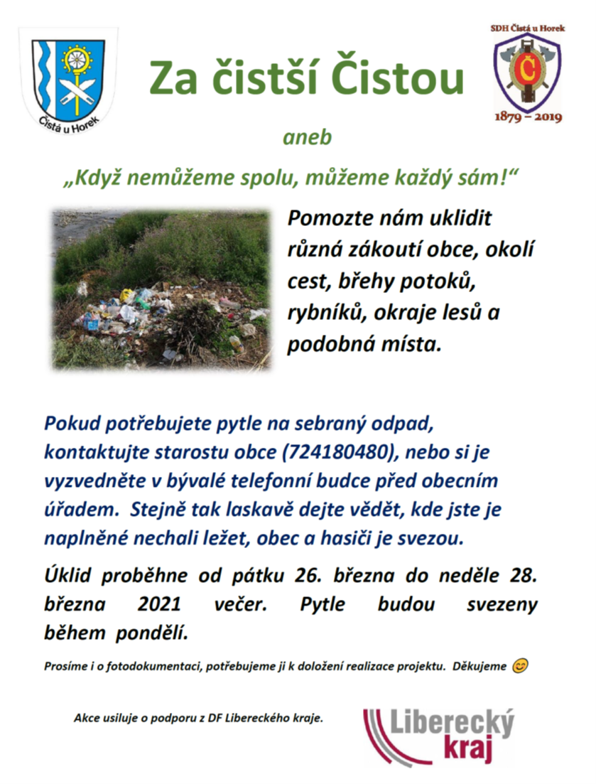 Sobota 27. března 2021 je vyhlášena hlavním jarním úklidovým dnem v rámci kampaně Ukliďme Česko. I u nás v Čisté u Horek bude možné se zapojit do této akce. Doba covidová sice společným aktivitám vůbec nepřeje, ale i tak je tu prostor pro úklid odpadků v obci a v jejím okolí pro jednotlivce nebo rodiny (společně žijící osoby z domácnosti). Oficiálně akce bude probíhat od pátku 26. do neděle 28. března. V praxi je možné si do pátku 26. března 2021, 12:00 hodin, vyzvednout na obecním úřadě (případně v prostoru bývalé telefonní budky před hasičskou zbrojnicí) pytle na odpad a motouzy k jeho zavázání. Vlastní úklid pak bude probíhat v pátek, sobotu a neděli, jak kdo bude mít čas, chuť, a nebo co dovolí počasí. Pytle se sebraným odpadem můžete nechat u cesty. Důležité však je nahlásit místo odložení pytle na mobil starosty obce a to nejpozději v neděli večer, aby mohly být v pondělí zaměstnanci obce a čisteckými dobrovolnými hasiči posbírány. Pojďte nám pomoci udělat místo, kde žijeme, čistším a uklizenějším. Děkujeme.