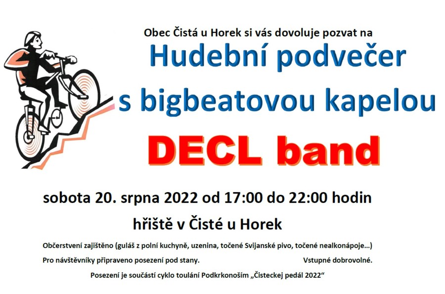 Letošní ročník cyklotoulek Podkrkonoším "Čisteckej pedál 2022" dozná drobné změny. Závěrečnou část doprovodí hudbou osvědčená kapela DECLBAND a to už páté hodiny odpolední. Přijďte si posedět a poslechnou pěknou muziku, nebo si i zatančit - prostě strávit příjemný podvečer na čisteckém hřišti. Konec akce je plánován na 22. hodinu.