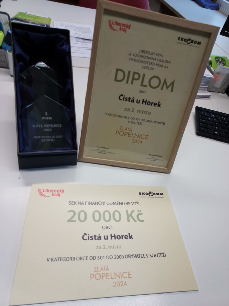 V pátek 23. května 2025 se na zámku ve Svijanech konalo vyhlášení výsledků soutěže Zlatá popelnice. Jejími organizátory jsou společnost EKOKOM a Liberecký kraj. Do této soutěže jsou zahrnuty všechny obce a města Libereckého kraje, která třídí odpad. Soutěž je rozdělena dle velikosti sídel do tří kategorií. Čistá u Horek se v roce 2024 v kategorii 500 - 2000 obyvatel umístila na druhém místě a získala kromě věcného daru také finanční částku 20.000,- Kč na zvelebení obce. Toto umístění svědčí o tom, že máme v Čisté slušný poměr přepočtu tříděného odpadu na obyvatele. Stejně ale jako ostatní obce se však potýkáme s velkým množstvím směsného komunálního odpadu. Děkujeme proto všem, kdo zodpovědně třídí a věříme, že i ten "komunál" se podaří důsledným tříděním ještě snížit....