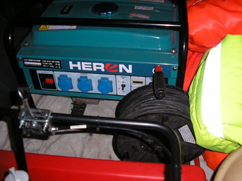 Pro pohon kalového čerpadla a pro nouzové osvětlení v místě zásahu byla pořízena elektrocentrála HERON. Má tři zásuvky na 220 V a další na 12 V. Obvykle k ní připojujeme osvětlovací soupravu s halogeny 2 x 500 W. Elekrocentrála je součástí vybavení vozidla Mitsubishi.