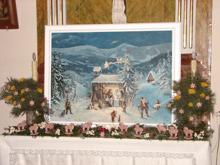 Nový kostelní betlém. Autorem obrazu je p. Schorm, perníčky napekla pí. Cermanová.